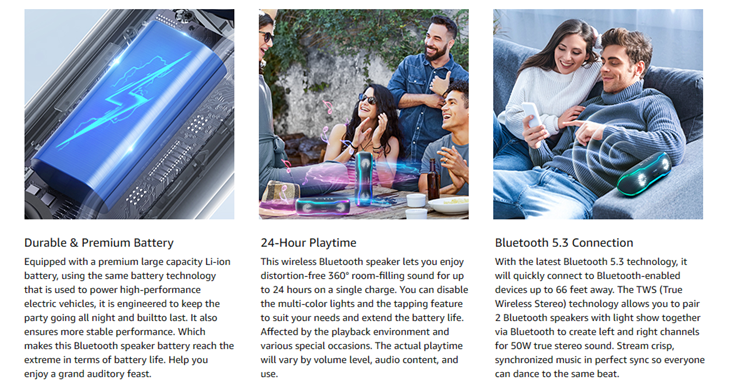 - [Bluetooth 5.3 & Up to 24 Hours Playtime] Bluetooth 5.3 provides incredible wireless Bluetooth range of up to 100 feet from your device. And this portable wireless Bluetooth party speaker lasts all day long with up to 24 hours of playtime per charge. You can turn on/off the multi-color lights & two hidden speaker lights by click the "Light Button" on the surface to suit your needs and extend the battery life. The actual playtime varies by volume level, audio content, and use.