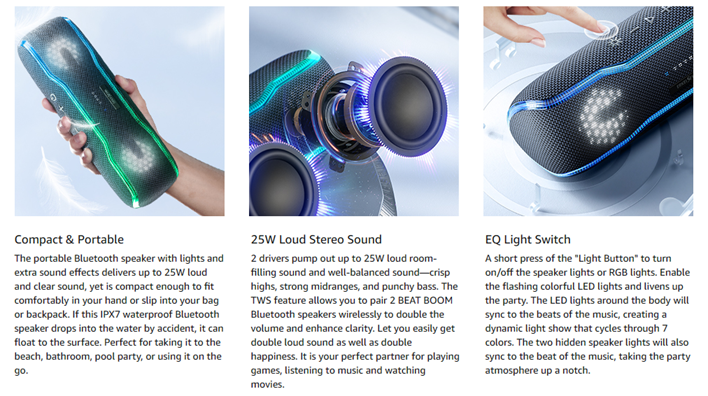 - [Loud Stereo Sound & Dual Pairing] Deliver surprisingly loud and well-balanced sound with virtually no distortion through 2 drivers and our proprietary technology. Enjoy up to 25W room-filling sound with punchy bass, strong midranges, and crisp highs. Pair 2 speakers together via Bluetooth to play the same music in perfect sync, double the volume, and create an immersive stereo sound experience. It is your perfect partner for playing games, listening to music and watching movies.