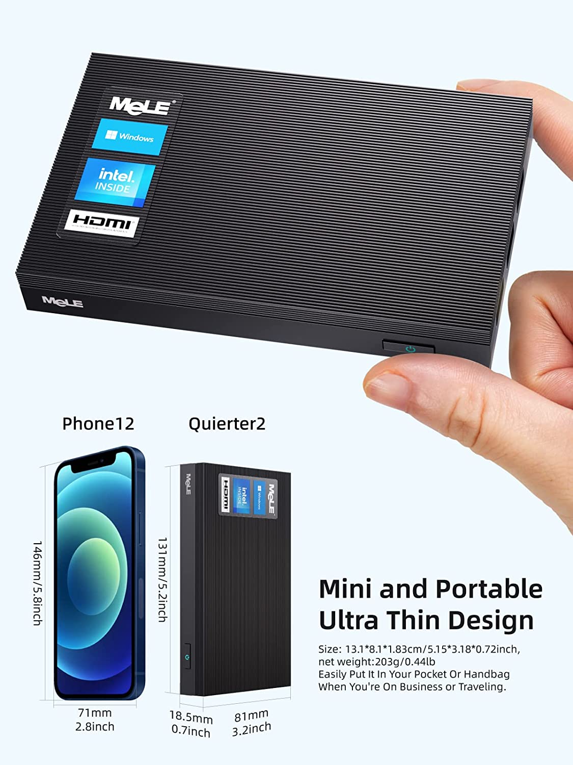 【MINI Size with Rich Interface】The small desktop pc with Only 5.15*3.18*0.72 inches, weight is only 203g/0.44lb,Small and light design makes the office more neat. You can carry it to everywhere. Ideal for the business trip.Mini Desktop PC MeLE Quieter2Q High-Performance version, including Gigabit Ethernet LAN (RJ45 port)| WiFi and Bluetooth 4.2 combo (Supporting Gigabit file transfer speeds)USB 3.0*4,HDMI*2,3.5mm Audio Jack *1,Type-C*1(Power supply only).