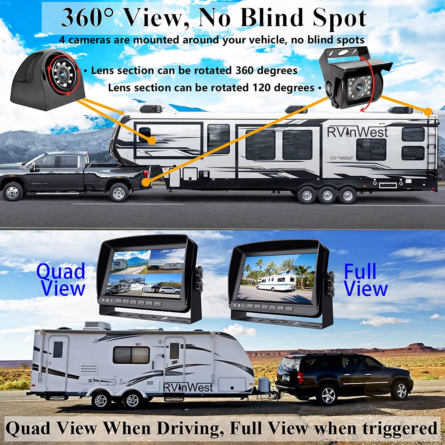 【360° View】With 4 cameras as front/rear/side camera, this rv backup camera system can not only provide rear view when you are parking or reversing but also provide 360° view when you are driving.