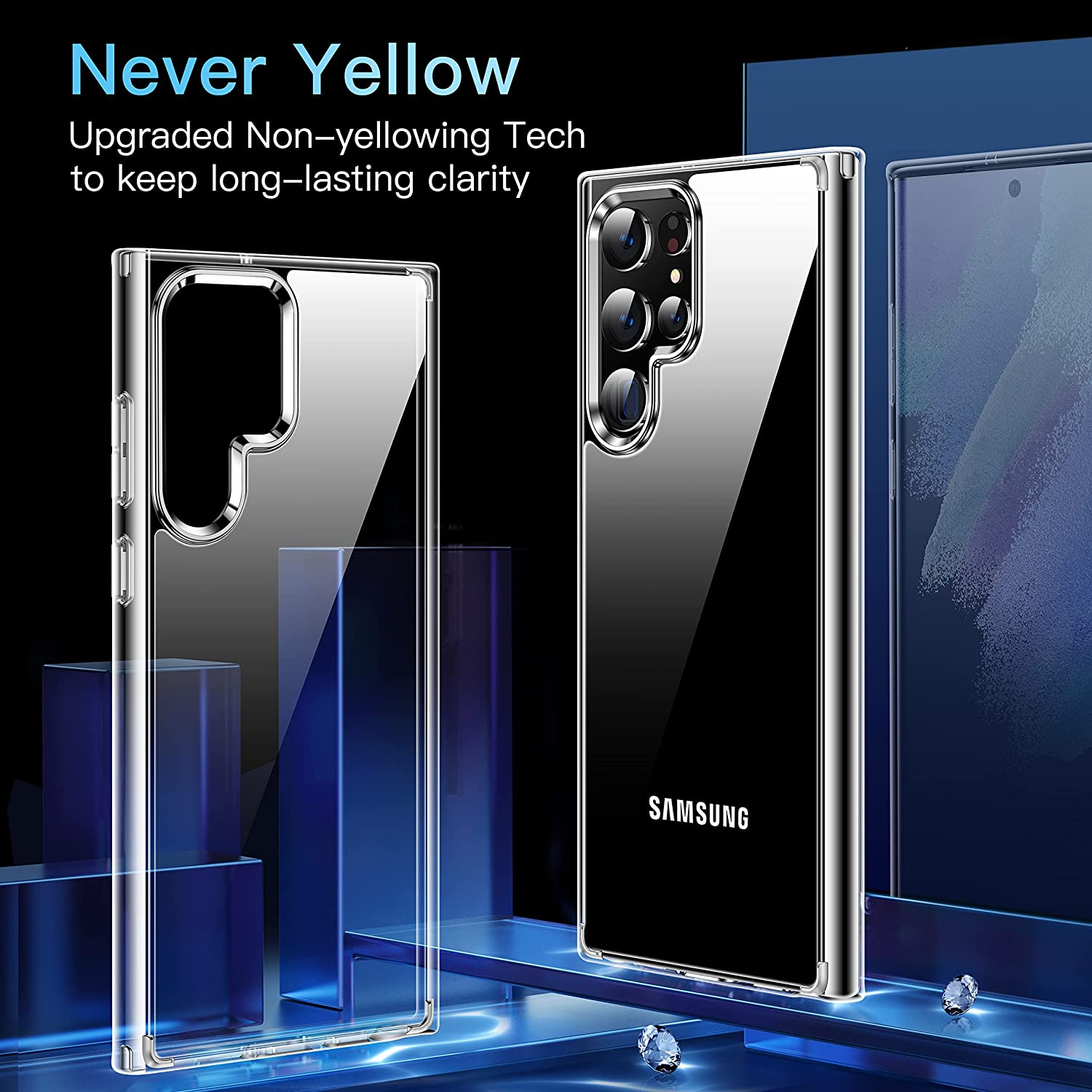 • ?[100% Crystal Clear & Never Yellow]: This crystal clear case is designed for Samsung S22 Ultra, fully shows the original beauty of your new Galaxy. After researching day and night select adopts upgraded Germany Top Bayer Material and Antioxidant molecule Layer to keep the long-lasting clarity than other. Shinning the beauty of your Galaxy all the time.