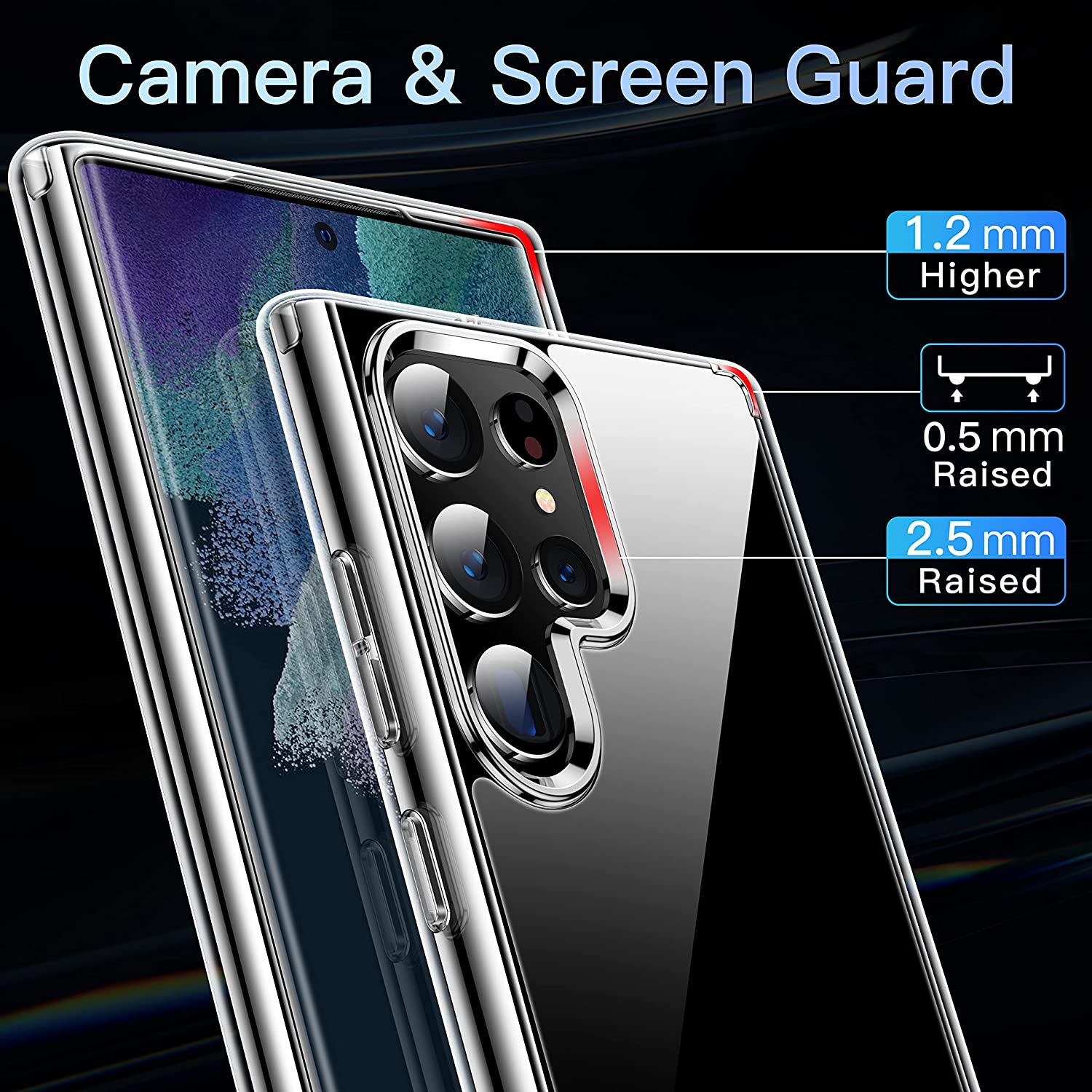 • ?[Enhanced Camera & Screen Protection]: 2.5 mm raised bezels for your beloved camera and 1.2 mm raised edges for screen help to protect from scratching and shattering even if your phone falls face-down & back-down.