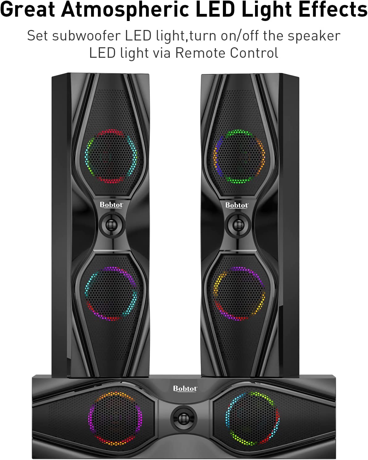 - Great LED Ambient Light Effect: The surround sound system speakers use high-quality materials, with LED lighting effect which makes full of atmosphere. The Subwoofer unit has 4 LED lighting modes: (blink to the beat, solid on, spectrum EQ analyzer, off).