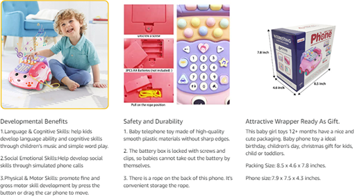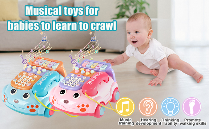 • ☎【A combination of phone music toys】: kids cell phone girl analog phone toys with integrated lights and sounds. Baby phone toy has 31 buttons, including musical instruments, music, lullabies, numbers, piano, and games, which can increase children's interest in music and enhance the hand-eye coordination of young children, children can easily drag the baby toy phone cartoon machine to anywhere by dragging the tow rope.