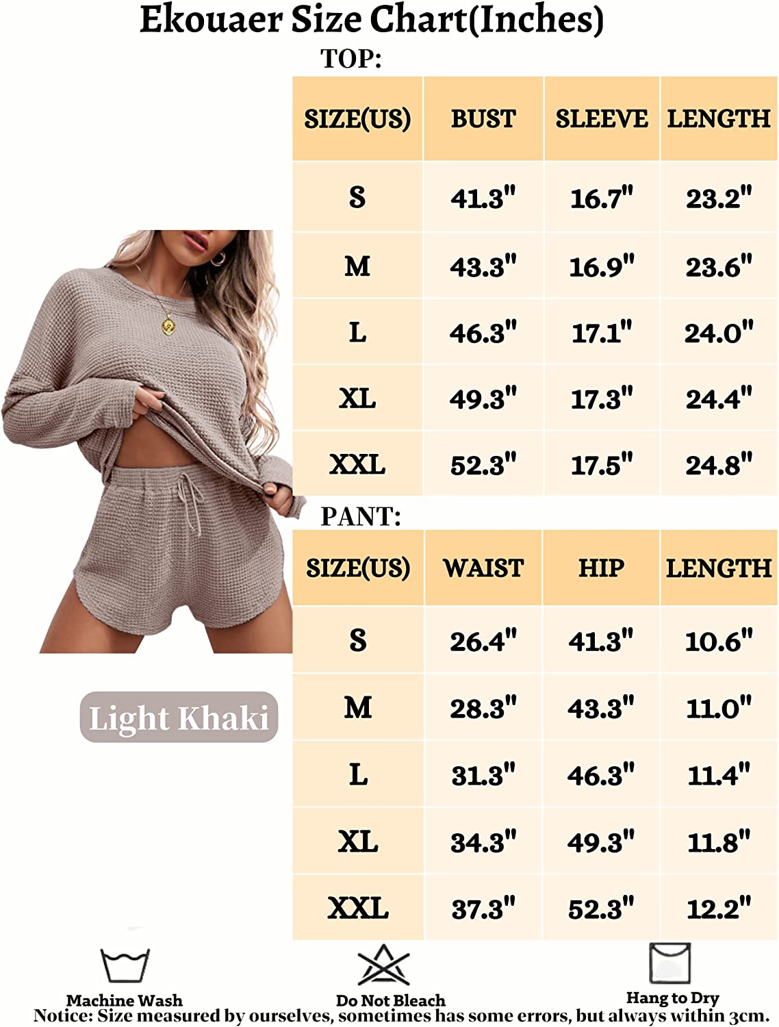 Ekouaer Womens Waffle Knit Pajama Sets Long Sleeve Top and Shorts Matching Lounge Set Loungewear Sweatsuit with Pockets