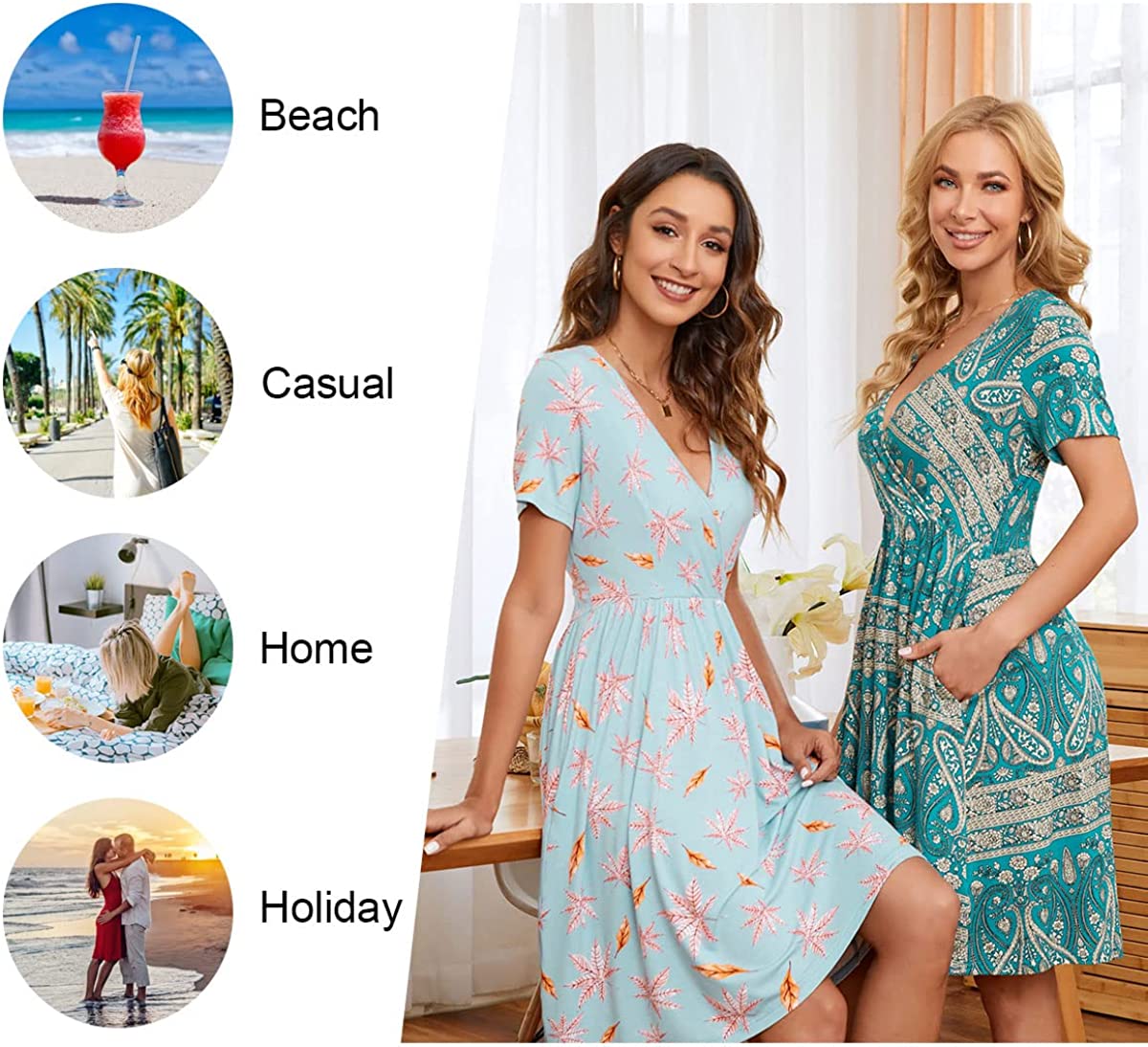 CATHY Womens Casual Tunic Dress Short Sleeve V Neck Dresses Loose Comfy Beach Sundress with Pockets