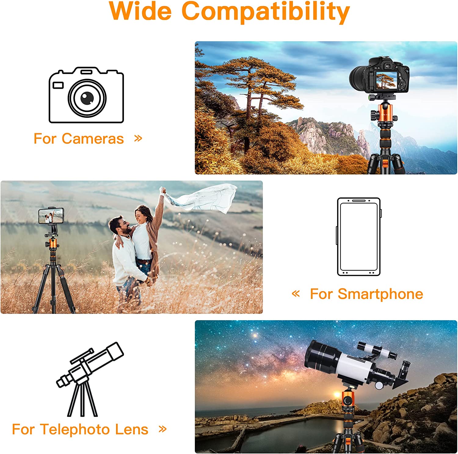 【High Quality & Flexible Design】 Made of aluminum alloy, light but strong tripod is with 3 built-in bubble levels and 2 quick release plats. 36mm ALUMINUM ball head that can rotate freely 360 degrees has strong wear and corrosion resistance. It provides a comfortable shooting experience and BETTER EQUIPMENT GUARANTEE each time