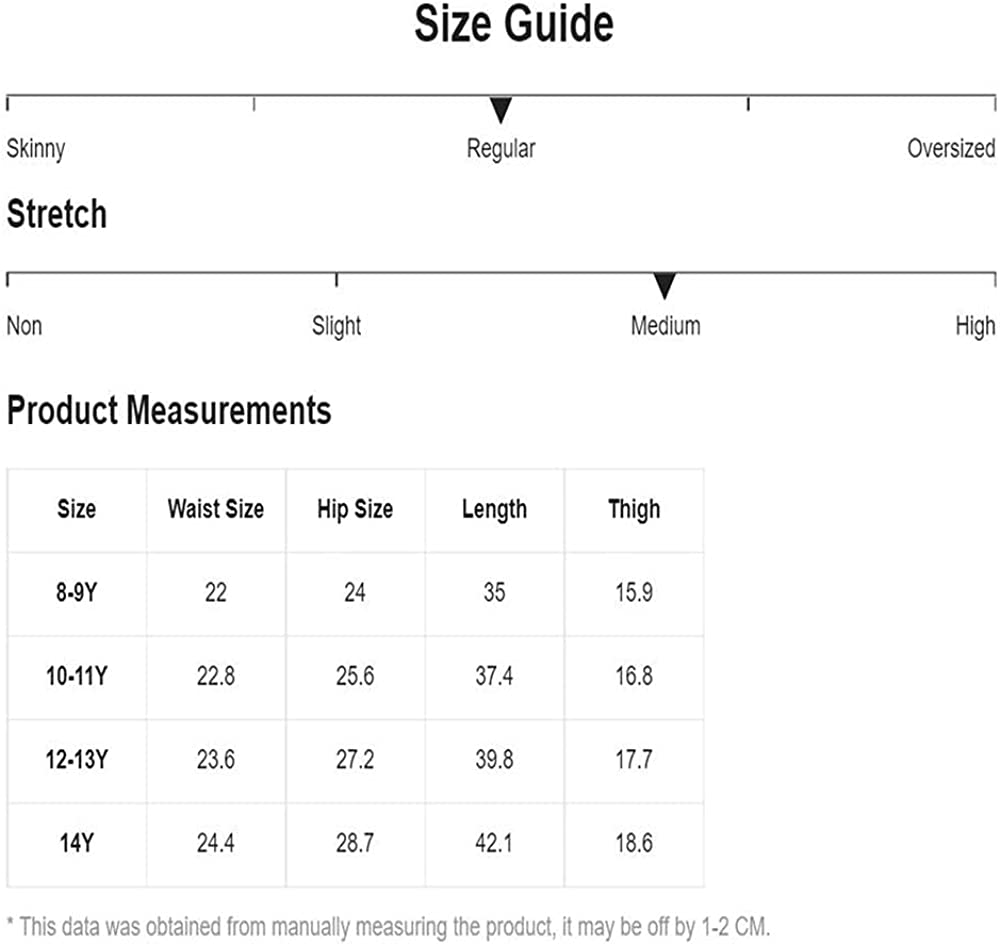 - Waist Size: (7Y) 19.9 inch; (8Y) 20.5 inch; (9Y) 21.1 inch; (10Y) 21.7 inch; (11-12Y) 22.8 inch