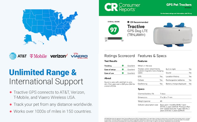 • WORLDWIDE LOCATION TRACKING - Use your GPS tracker for cats throughout the USA, Canada and 150 other countries. Manage all features via the free Tractive GPS app for iOS and Android or in any browser.