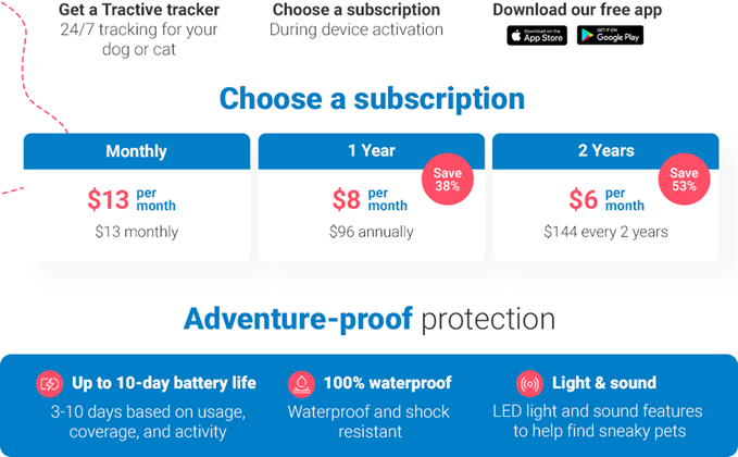 • DESIGNED FOR CATS & 100% WATERPROOF - Rain, shrubs and trees are no problem for Tractive. Best for medium-sized cats or larger (9lb +)