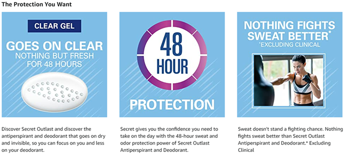 Sweat is the last thing you need to be worried about. Take one worry off of your plate first thing in the morning. With a couple quick swipes, you'll have confidence all day. Secret Outlast fights sweat better* so you get all strength and no sweat for 48 hours. Clear Gel goes on clear for no white marks. When you use Secret, you're getting the peace of mind that your deodorant will work as hard as you do. *Vs. Leading invisible solid