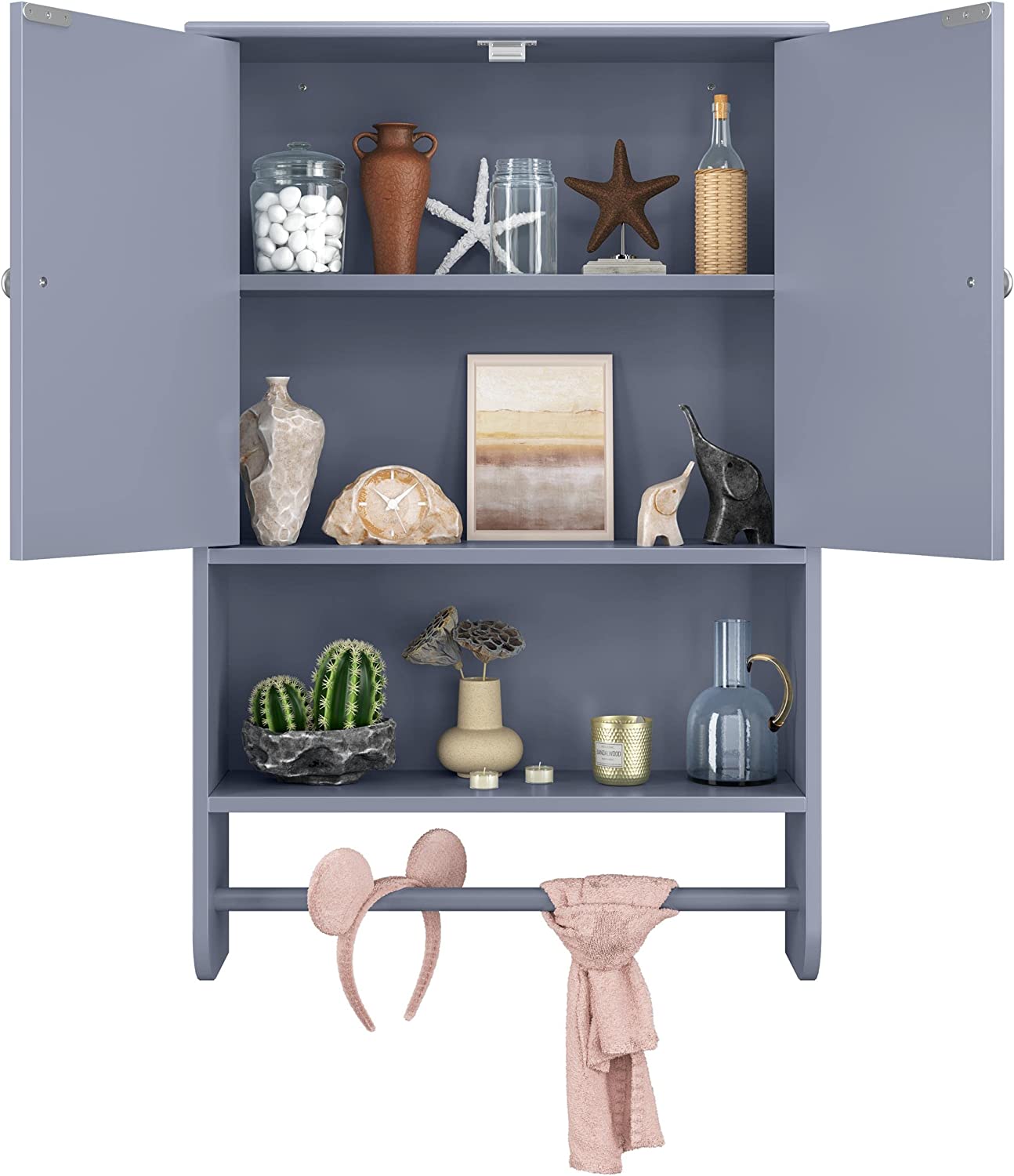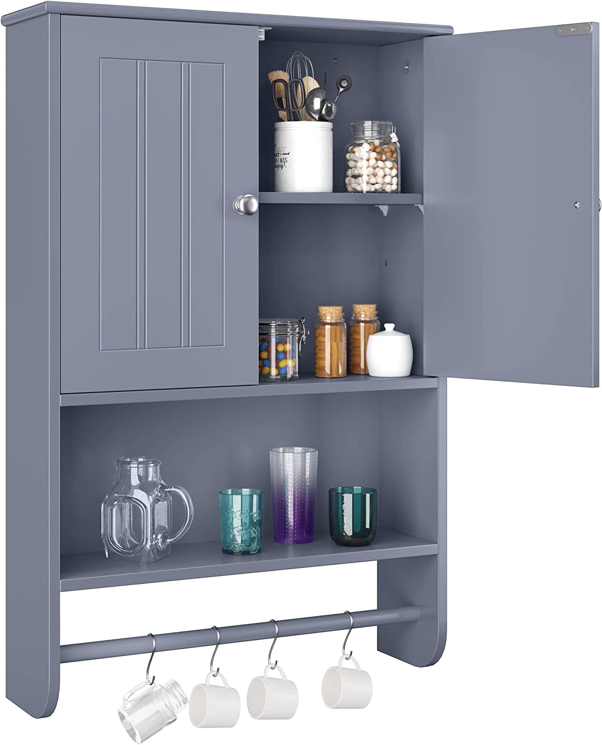 Topeakmart Wall Storage Cabinet with Inner Adjustable Shelf and Shaker Doors, Hanging Cabinet with Towel Bar for Living Room Kitchen Decor, Grey