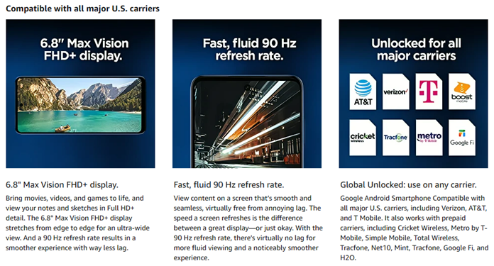 • Carrier compatibility: AT&T: VoLTE, Verizon: VoLTE, T Mobile: VoLTE, WiFi Calling, Video Calling, Tracfone: GSM, Spectrum: VoLTE, Wi-Fi calling Does not support: Boost, U.S. Cellular, Google Fi, Republic Wireless, Tracfone (CDMA), Straight Talk Wireless (CDMA), Ting, Xfinity Wireless, Optimum Mobile. For all carrier compatibility details - please check the product images in detail.Form_factor : smartphone