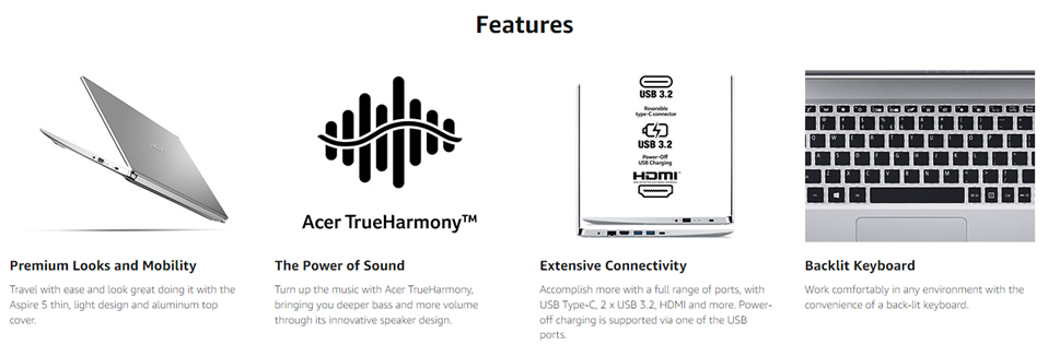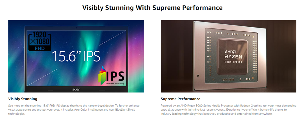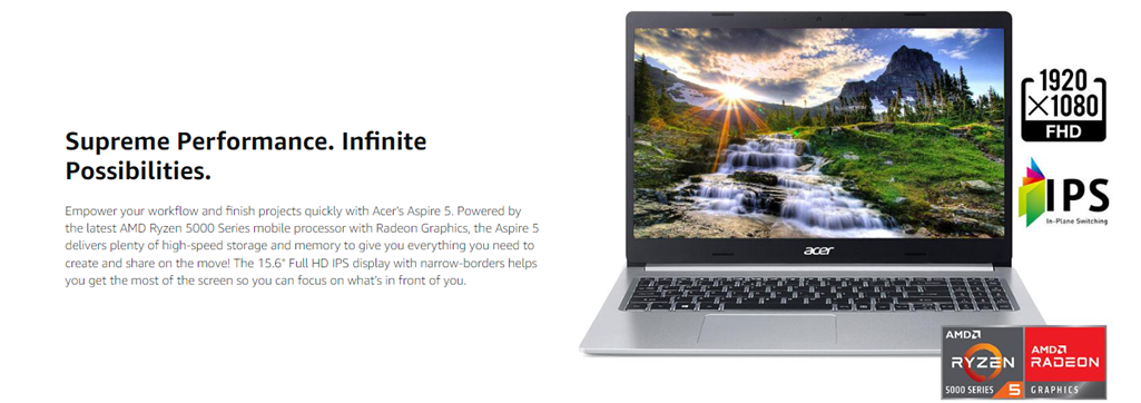 Acer Aspire 5 A515-45-R1YC comes with these high level specs: AMD Ryzen 5 5500U Hexa-Core Mobile Processor 2.1GHz with Precision Boost up to 4.0GHz (Up to 8MB L3 Cache), 15.6" Full HD (1920 x 1080) widescreen LED-backlit IPS Display, AMD Radeon Graphics, 8GB DDR4 On-Board Memory, 256GB NVMe SSD, 1 - Available Hard Drive Bay, True Harmony Technology, Two Built-in Stereo Speakers, Acer Purified.Voice Technology with Two Built-in Microphones, Intel Wireless Wi-Fi 6 AX200 802.11ax Dual-Band 2.4GHz and 5GHz featuring 2x2 MU-MIMO technology, 10/100/1000 Gigabit Ethernet LAN (RJ-45 port), Bluetooth 5.0, HD Webcam (1280 x 720), 1 - USB 3.2 (Type-C) Gen 1 port (up to 5 Gbps), 2 - USB 3.2 Gen 1 Ports (one with Power-off Charging), 1 - USB 2.0 Port, 1 - HDMI 2.0 Port with HDCP support, Backlit Keyboard, Lithium-Ion Battery, Up to 11-hours Battery Life, Windows 10 Home, 3.88 lbs. | 1.76 kg (system unit only) (NX.A84AA.002)