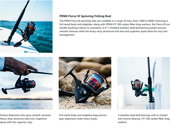 The PENN Fierce III spinning reels are available in a range of sizes, from 1000 to 8000. Featuring a full metal body and sideplate, along with PENN HT-100 carbon fiber drag washers, the Fierce III can handle anything inshore or nearshore. A 4+1 shielded stainless steel ball bearing system ensures smooth retrieves while the heavy-duty aluminum bail wire and superline spool allow for easy line management.