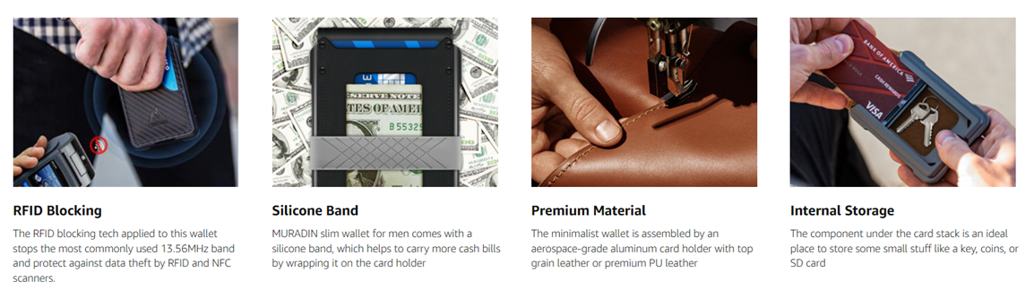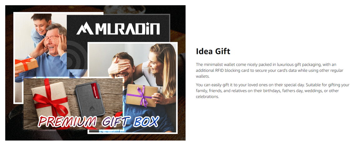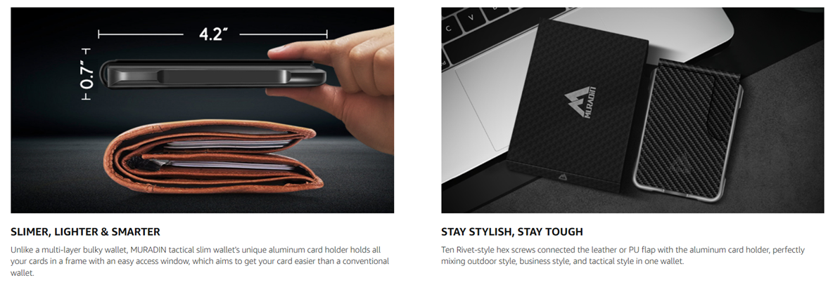 RFID BLOCKING WALLET: You don't have to sacrifice the great looks of a leather credit card wallet for security. RFID blocking protection is given to the MURADIN minimalist wallet due to the metal frame, so you can use it safely as a travel wallet, cards holder, or front pocket wallet.