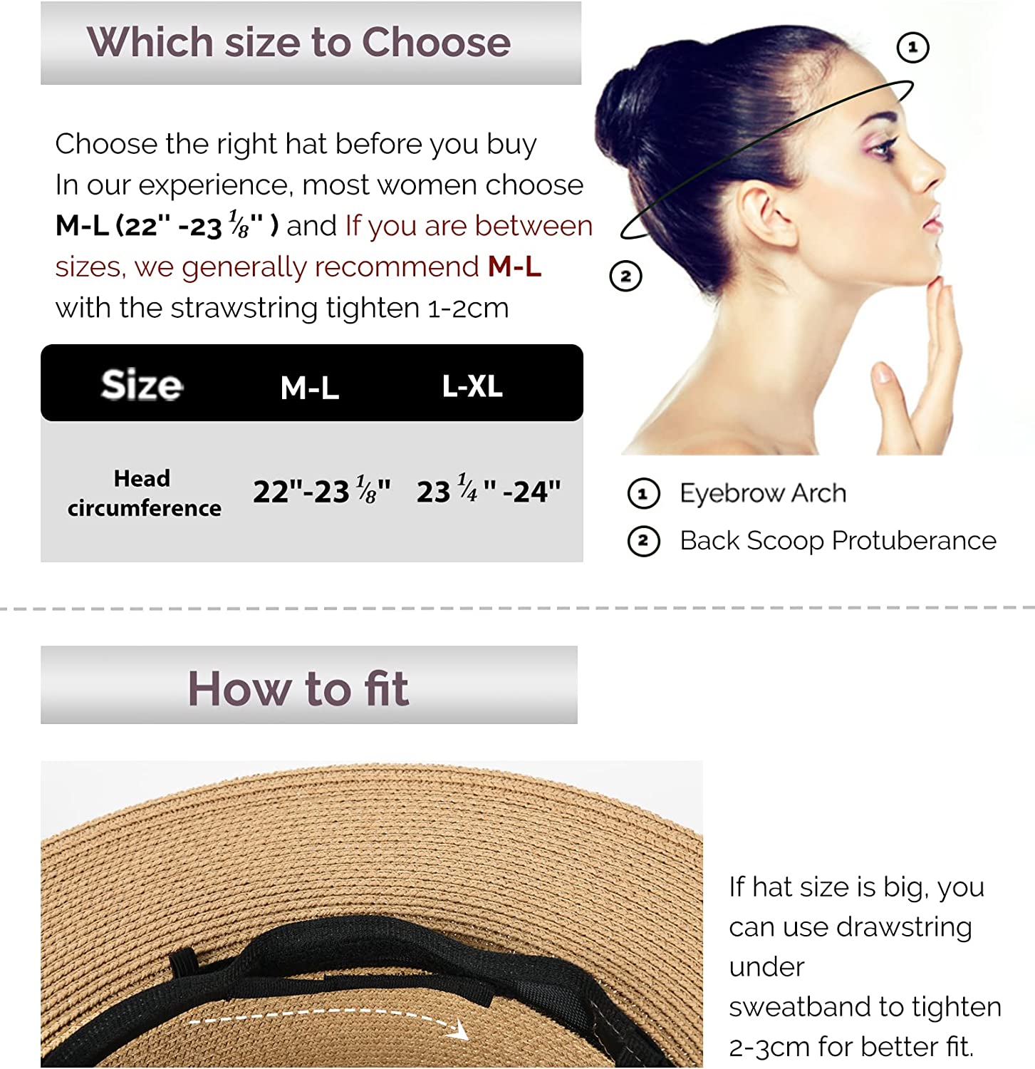 Two Sizes to Fit Most: Two sizes are offered for this beach hats; Size M is recommended for head circumference around 22"-23 1/8" and Size L is recommended for head circumference around L 23 1/8"-24" ; If you feel it is too tight or too loose, you can adjust the size by inner velcro; Also, a detachable chin strap can hold it in place in blustery days,that you can keep the hat stable on top of your head.And Inner sweat band to help wick away moisture during the hot & humid summer seasons;
