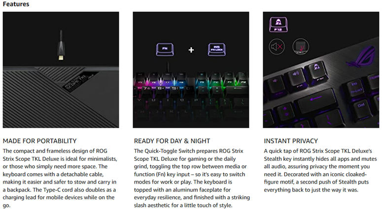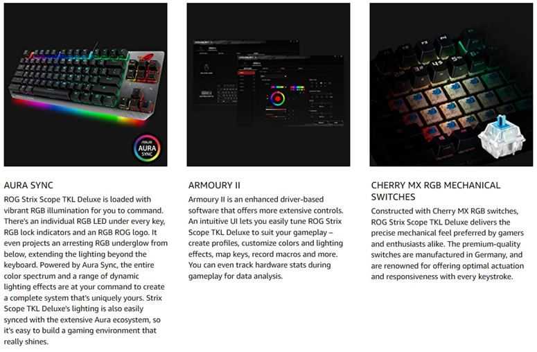 - COMPACT GAMING KEYBOARD - Designed to provide broader mouse space, ASUS ROG Strix Scope TKL Mechanical Gaming Keyboard is made of German Cherry MX Brown switches that offer enhanced gaming performance with faster, more responsive keystrokes