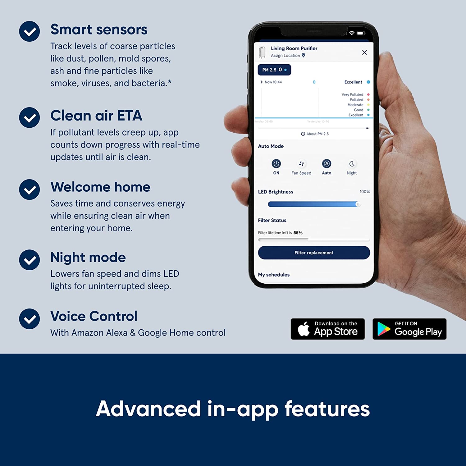 • NIGHT MODE AND OTHER FEATURES: ‘Night Mode’ lowers fan speed and dims LED lights for uninterrupted sleep; 'Welcome Home’ feature saves time and conserves energy while ensuring clean air when entering your home