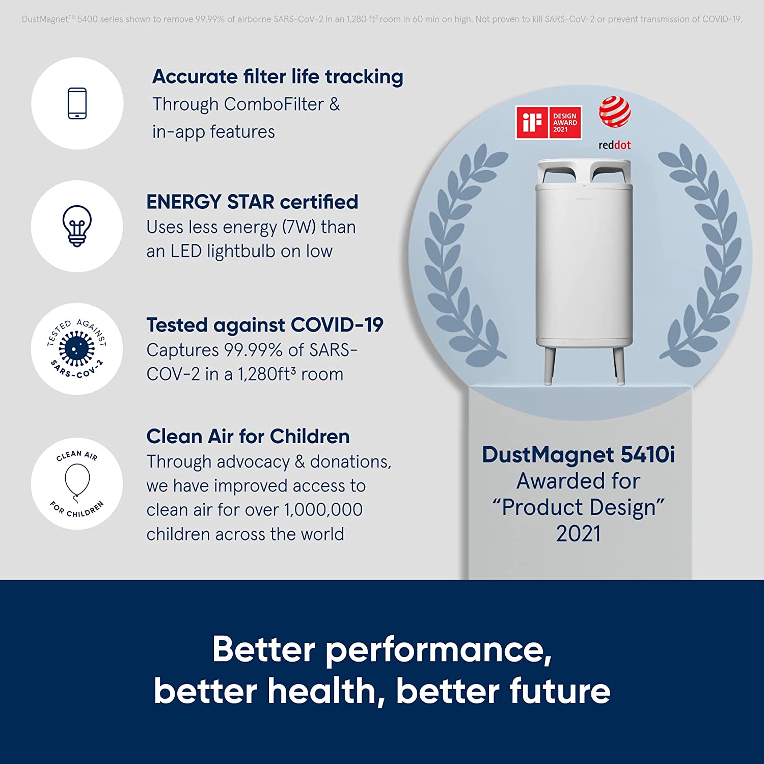 • MOST AWARDED AIR PURIFIER BRAND IN THE US: DustMagnet 5410i has won the 2021 RedDot - Product Design and IF - Product Design awards; Sleek, convenient tabletop surface compliments aesthetic while cleaning your air without cramping your style