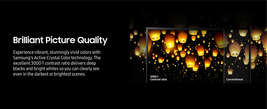- BRILLIANT PICTURE QUALITY: Experience vibrant, vivid colors with Samsung's Active Crystal Color technology; The excellent 3000:1 contrast ratio delivers deep blacks and bright whites so you can see clearly even in the darkest or brightest scenes
