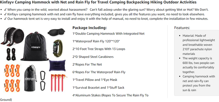 • ☀【Everything Included】: Our camping hammock set includes a Double Hammock with Net and Rain Fly(120*120 Inches), 2*10 Feet Tree Straps with 13 Loops(600 lbs), 2*D Shaped Steel Carabiners, 2*Net Ropes, 6*Guylines, 4*Aluminum Stakes, 1*Travel Pillow, 1*Eye Mask, 1*5 In 1 Survival Bracelet, 1*Pocket/Stuff Sack, 1*Installation Manual. No need to look elsewhere!