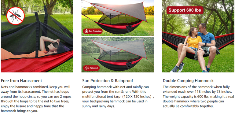 • ☀【Top Quality Material】: The hammock tent is made of high quality professional strong & lightweight breathable woven 210T parachute nylon materials and special designed durable bug net fabric. Small and dense mesh can effectively prevent harassment. If you do not want use with the net, turn it to the downside, and enjoy the happy time without the net.