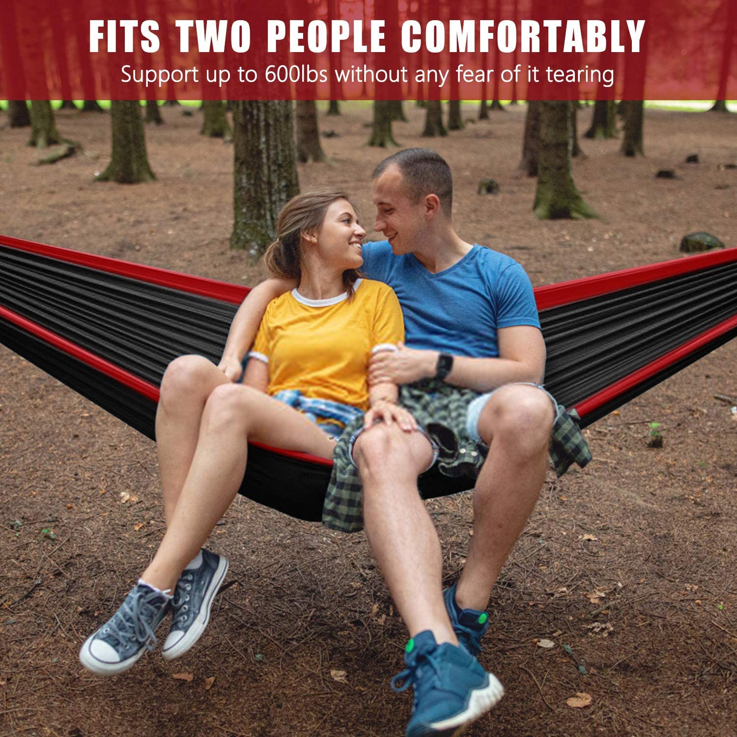 • ☀【Roomy Design for Comfort】: The dimensions of the hammock when fully extended reach over 118 inches by 78 inches. The weight capacity is 600 lbs, making it a real double hammock where two people can actually lie comfortably together. The travel hammock is extremely lightweight, weighing only 2 lbs. And packs up to the size of a volleyball, and takes up little space in your backpack for camping, hiking, travel or outdoor adventures.