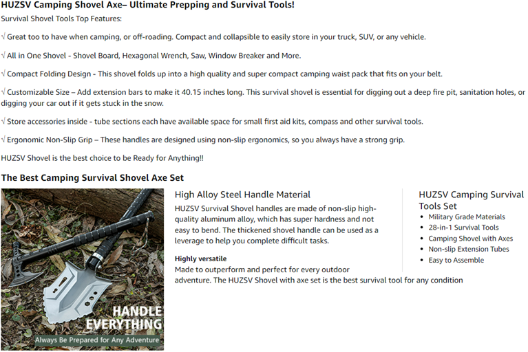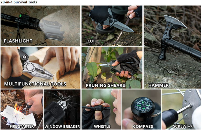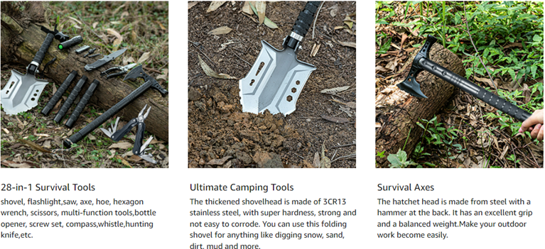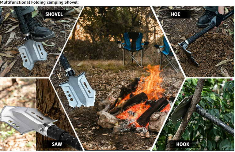 • 28-in-1 Survival Tools:Features 28 tools in this convenient folding shovel set:shovel, flashlight,saw, axe, hoe, hexagon wrench, scissors, multi-function tools,bottle opener, screw set, compass,whistle,hunting knife,etc.