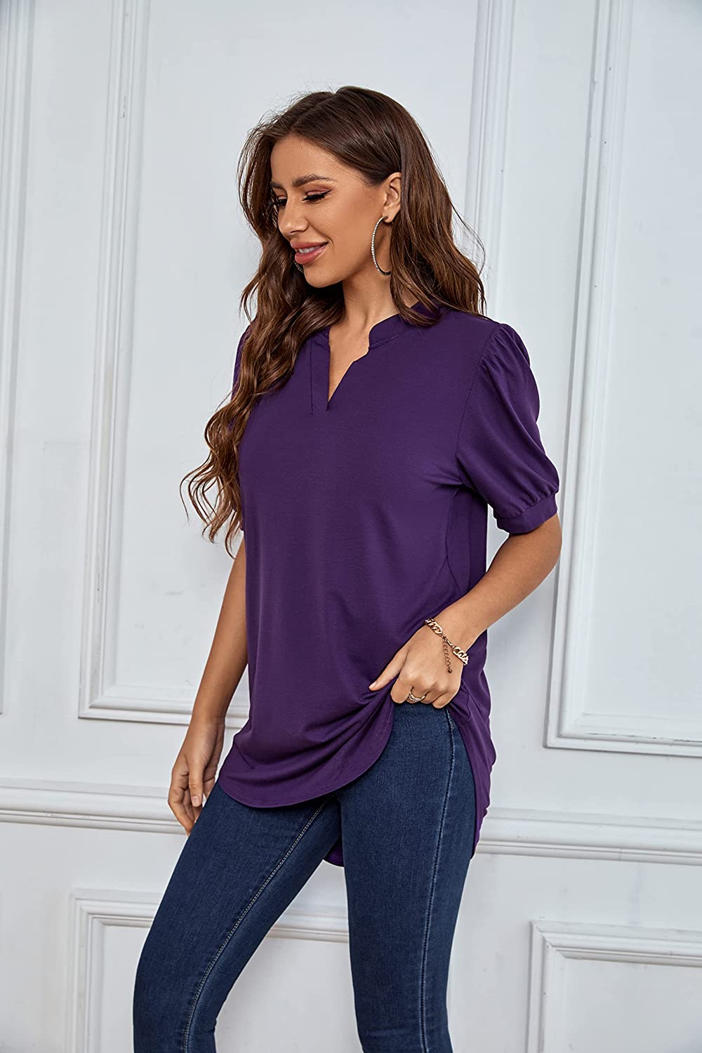 This shirt also features a v-neckline, cute collar detail, roll up 3/4 sleeves, a rounded hemline, and a trendy high-low cut! From the boardroom to the backyard, this beautiful tunic will have your heart all season long! Great choice for date, casual, daily life, work, vacation, outdoor, party, shopping.