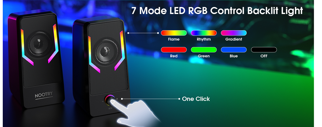 - 【Effortless One-Knob Control】 Delicate one-knob design enables these stereo PC speakers to easily realize ON/OFF, switch light mode, switch mode, and volume up and down instead of complicated independent buttons.