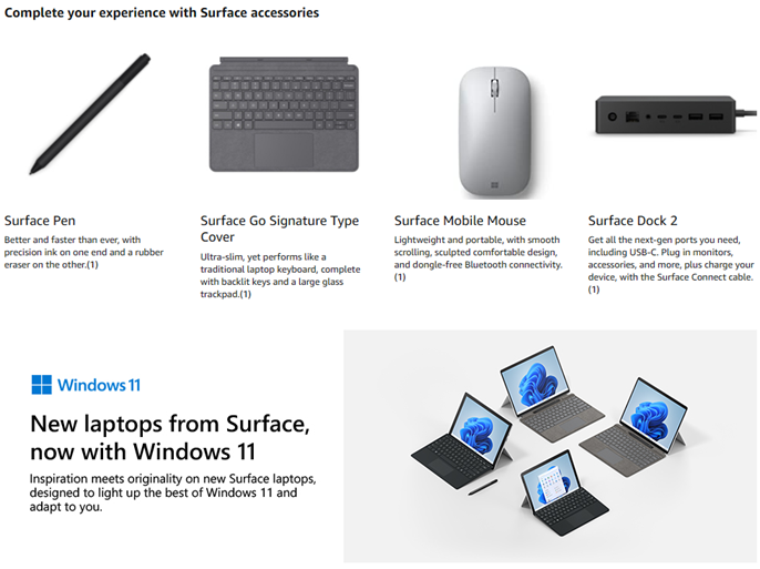 * Some accessories and software sold separately. Available colors and materials may vary by market and configuration. 1. Up to 11 hours of battery life based on typical Surface device usage. Testing conducted by Microsoft in August 2021 using preproduction software and preproduction configurations of Surface Axton. Testing consisted of full battery discharge with a mixture of active use and modern standby. The active use portion consists of (1) a web browsing test accessing 8 popular websites over multiple open tabs, (2) a productivity test utilizing Microsoft Word, PowerPoint, Excel and Outlook, and (3) a portion of time with the device in use with idle applications. All settings were default except screen brightness was set to 150nits with Auto-Brightness disabled. Wi-Fi was connected to a network. Tested with Windows Version 11.0.22000.9 (21H2). Battery life varies significantly with settings, usage and other factors. (4) Weight not including Surface Go Type Cover. (5) Requires Microsoft 365 subscription, sold separately. (6) Windows Defender version 4.12 & 4.18 scored 100% detection for protection against 0-day malware attacks, inclusive of web and e-mail threats (Real-World Testing) by AV-Test, July and August, 2019. (7) OneDrive PC folder backup feature must be enabled by user and files must be saved in Desktop, Pictures, or Document folders available on Windows PC’s only.