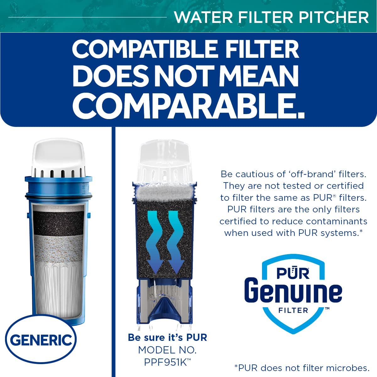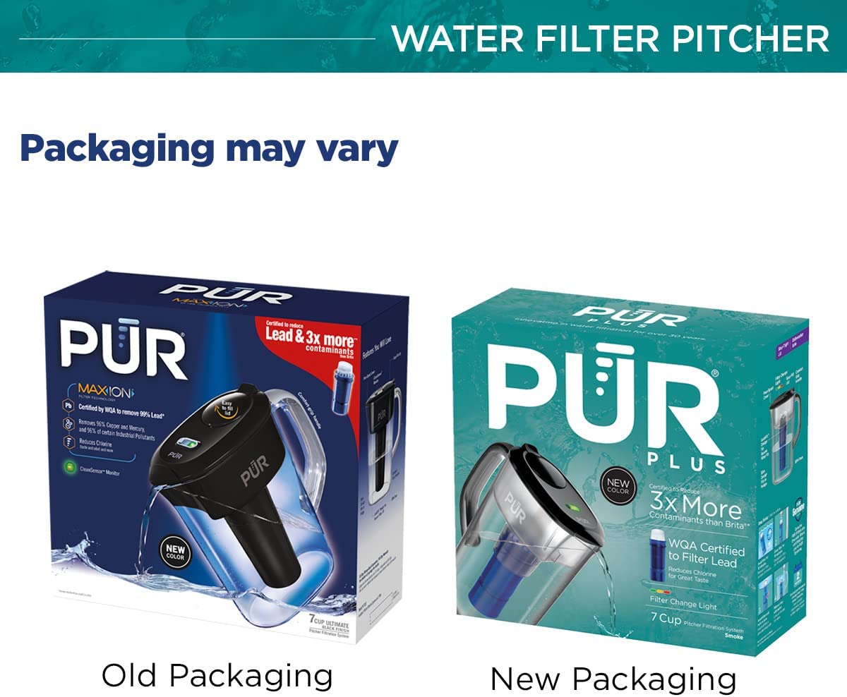 • PUR PLUS PITCHER WITH LEAD REDUCTION FILTER – PUR PLUS water filtration pitcher filters are WQA certified to reduce lead and other chemical and physical contaminants that could be in your water. PUR PLUS Pitcher Filter PPF951K is certified to reduce 3X more chemical contaminants than Brita's leading pitcher filter.*