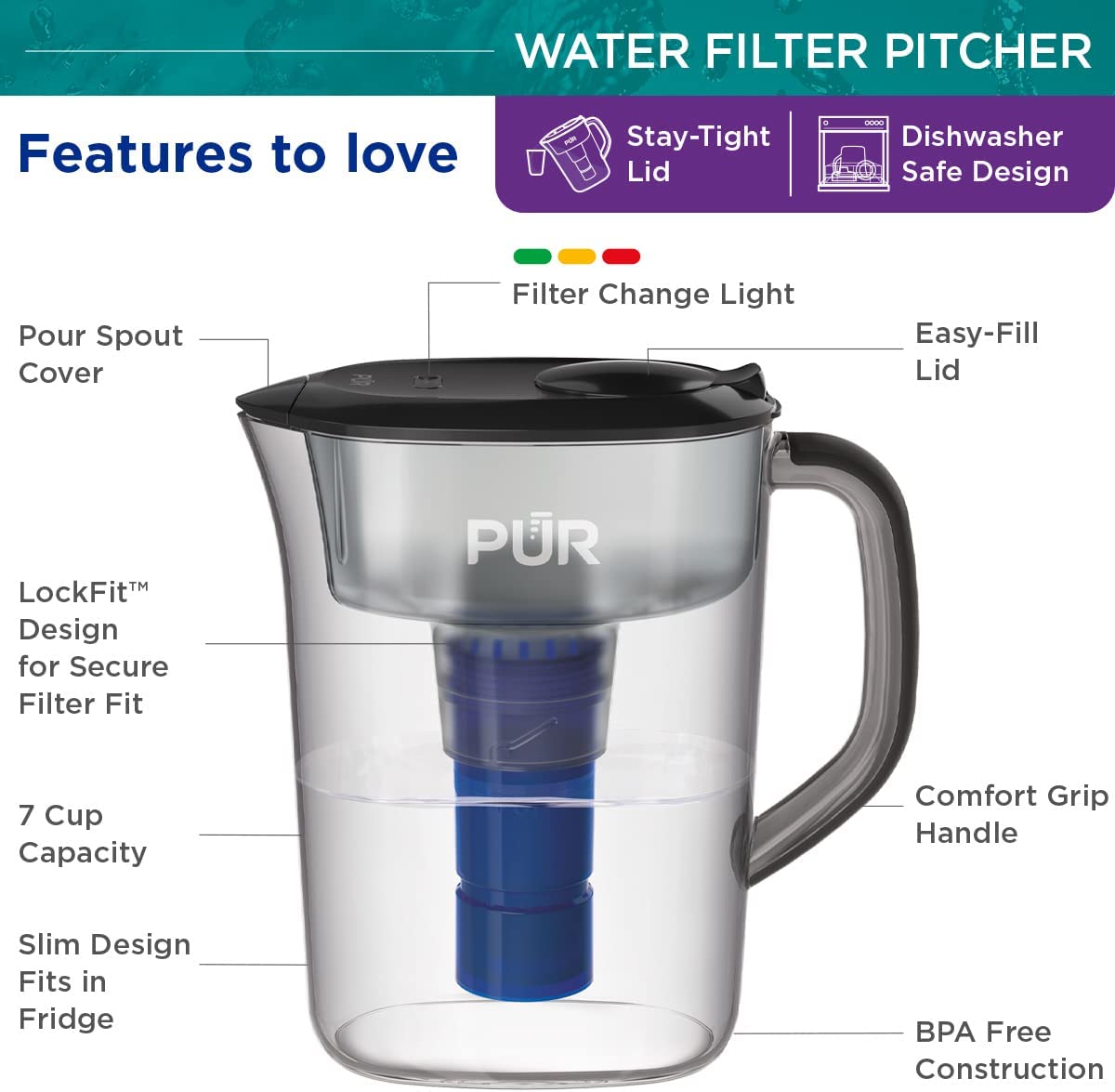 • WATER FILTRATION SYSTEM – Quickly and easily enjoy cleaner, filtered water in your fridge with the PUR PLUS 7 Cup Chemical and Physical Filtration Water Pitcher. This water filter pitcher features an easy-fill lid and a Filter Change Light to indicate filter status.