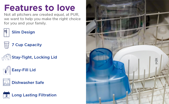The PUR 7 Cup Water Filter Pitcher offers refreshing water quickly and easily. Each PUR water filter is certified to reduce mercury and certain industrial pollutants, as well as reducing chlorine (taste and odor) and more. The filter lasts up to 2 months and gives you 40 gallons (or 640 8oz cups) of great-tasting water. PUR’s superior filter technology uses activated carbon and ion exchange media and is certified to reduce 2x more contaminants than Brita’s leading water pitcher filter.* The PUR filtered water pitcher has a slim, space-saving design that fits easily in the fridge, while the comfort-grip handle and easy-fill lid make it easy to use. A water filtration system is important because tap water may look clean but can contain potentially harmful contaminants from pipes. Compatible water filter replacements are not certified to offer the same water quality – genuine PUR Filters are the only filters certified for use in PUR systems. Using a PUR water filter system can save up to $1,000 per year on average compared with the cost of bottled water** and help keep plastic bottle waste out of landfills. Each replacement water filter provides 40 gallons of filtered water or up to 2 months of typical use. PUR has been developing innovative technologies for superior water filtration for over 30 years. We believe life deserves PUR water. Disclaimers: PUR does not filter microbes. *Versus best-selling Brita® pitcher filter OB03. Brita® is a trademark of Brita LP. **Based on comparing a year's worth of bottled water (16.9 oz) to a PUR Dispenser a year's worth of 9 refills. Based on Nielsen US Scantrack sales.