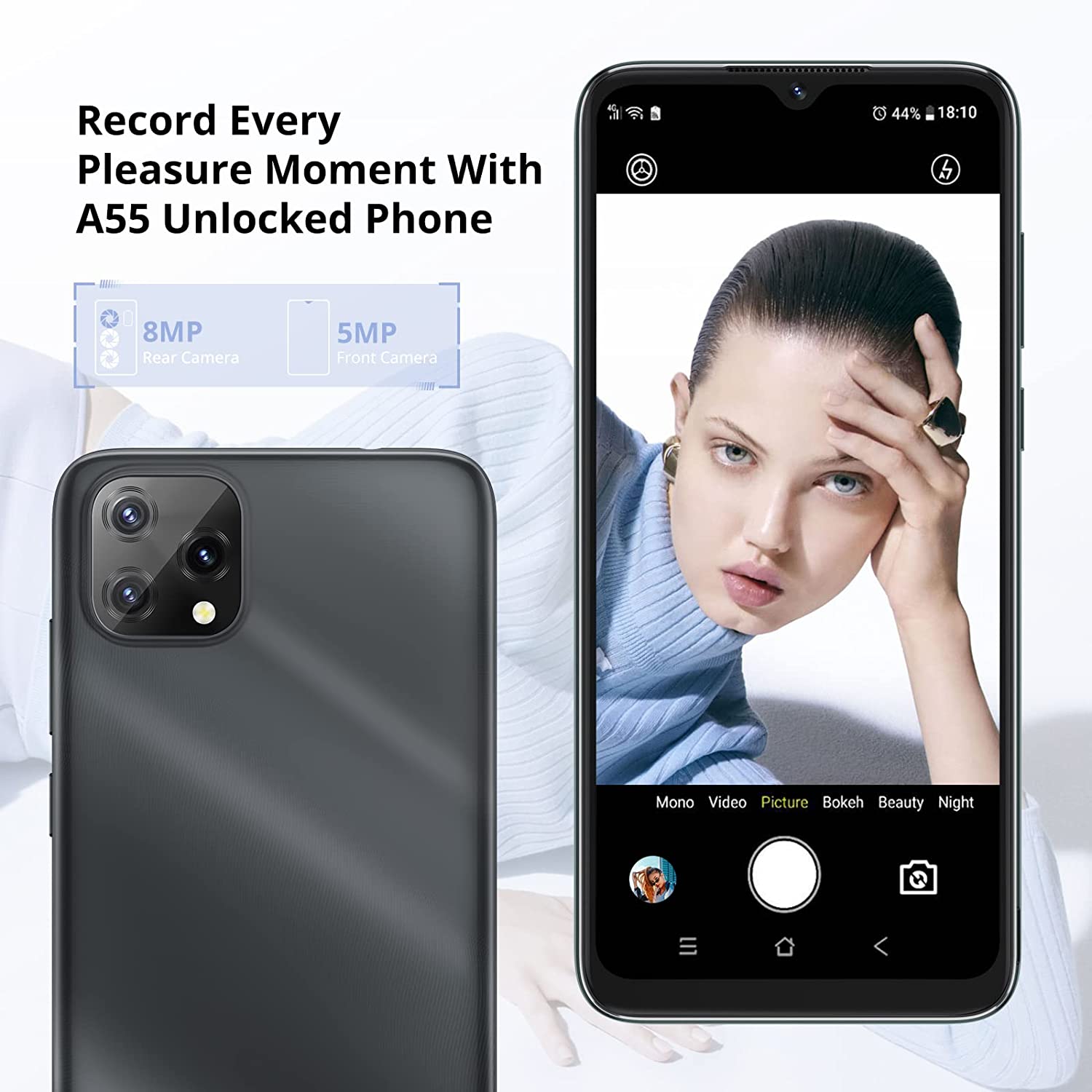 • ?6.528-inch large screen + 89% screen ratio?The Unlocked Cell Phone A55 has a 6.528-inch high-definition water drop screen, which is silky smooth and responsive. The built-in 20:9 full screen with water droplets, with a screen-to-body ratio of 89%, brings you a wider visual experience, and the brightness of 400nits allows you to clearly read the contents even in the sun. 9.1mm ultra-thin design, 196g thin and light body, A55 is a stylish and powerful affordable phone!