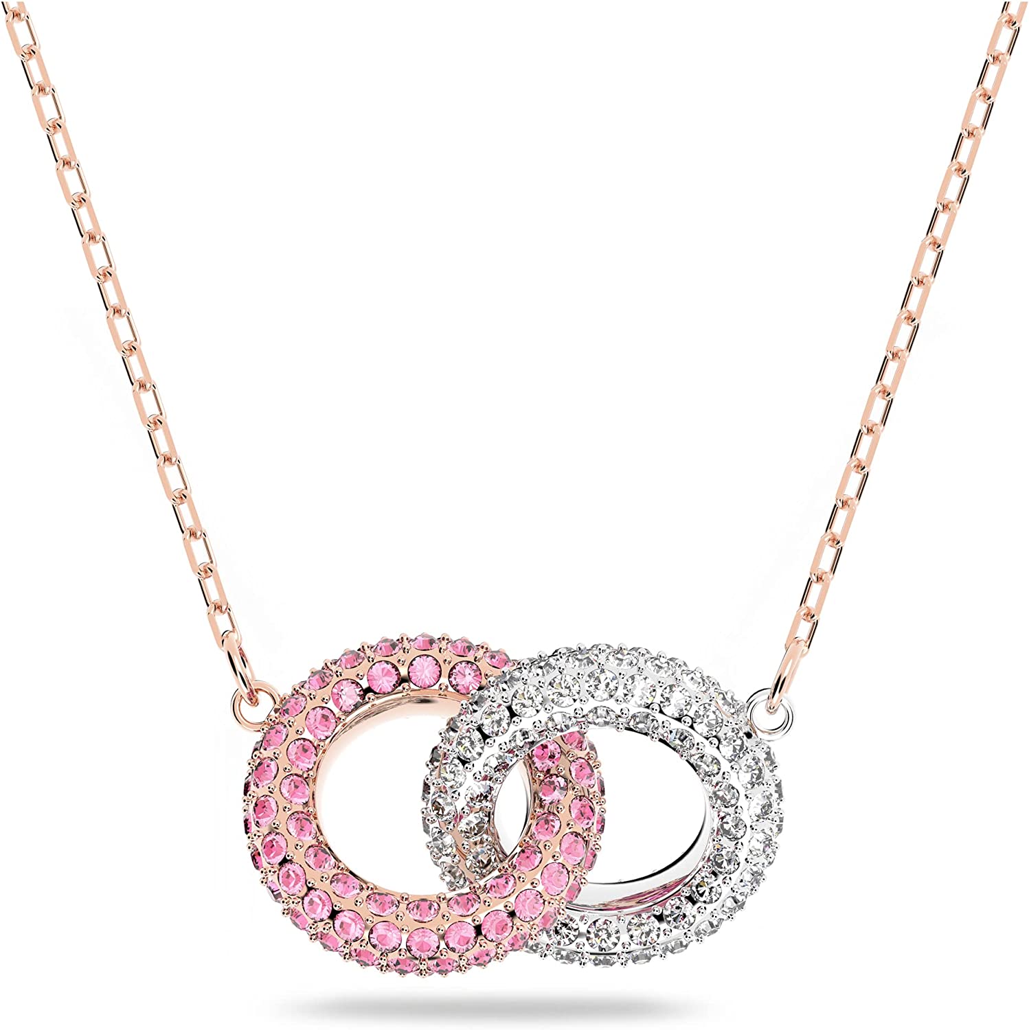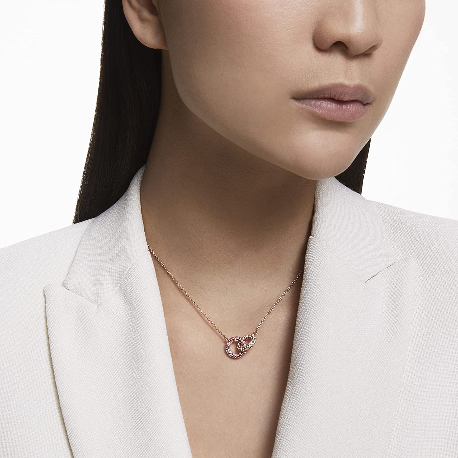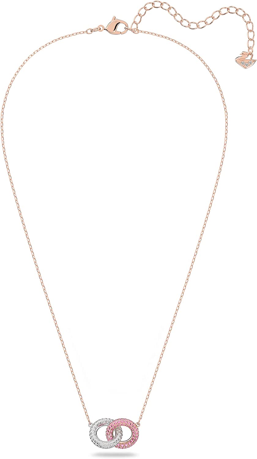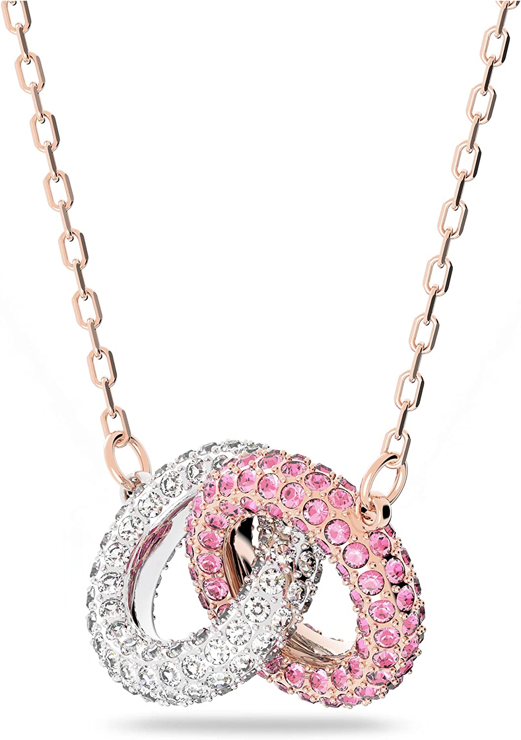 • Items delivered: (1) Swarovski Stone pendant necklace with interlocking circle motifs, clear and pink crystal pavé, on rose gold-tone finish chain, complete with Swarovski necklace box