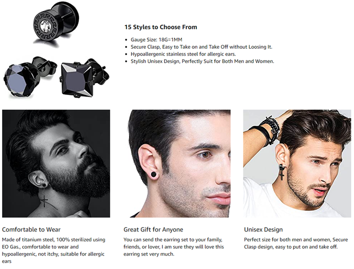 Earring Set Include - 15 pairs of men's earrings and ear studs come with a beautiful box, 4 pairs of circle earring hoops, 3 pairs of black dangle-hinged hoop earrings, and 8 pairs of different shapes of black ear studs. More wearing choice, suitable for men and women.