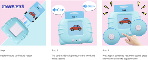 [ Easy to Use ] - Put the card into the card reader’s slot, the card reader will pronounce the words. When an animal card or transport card is inserted the card reader will play real animal or transport’s sound. Press the repeat button to repeat the pronunciation and sound effect. This montessori toy keeps kids away from mobile phone and tablets, reduce screen time effectively.