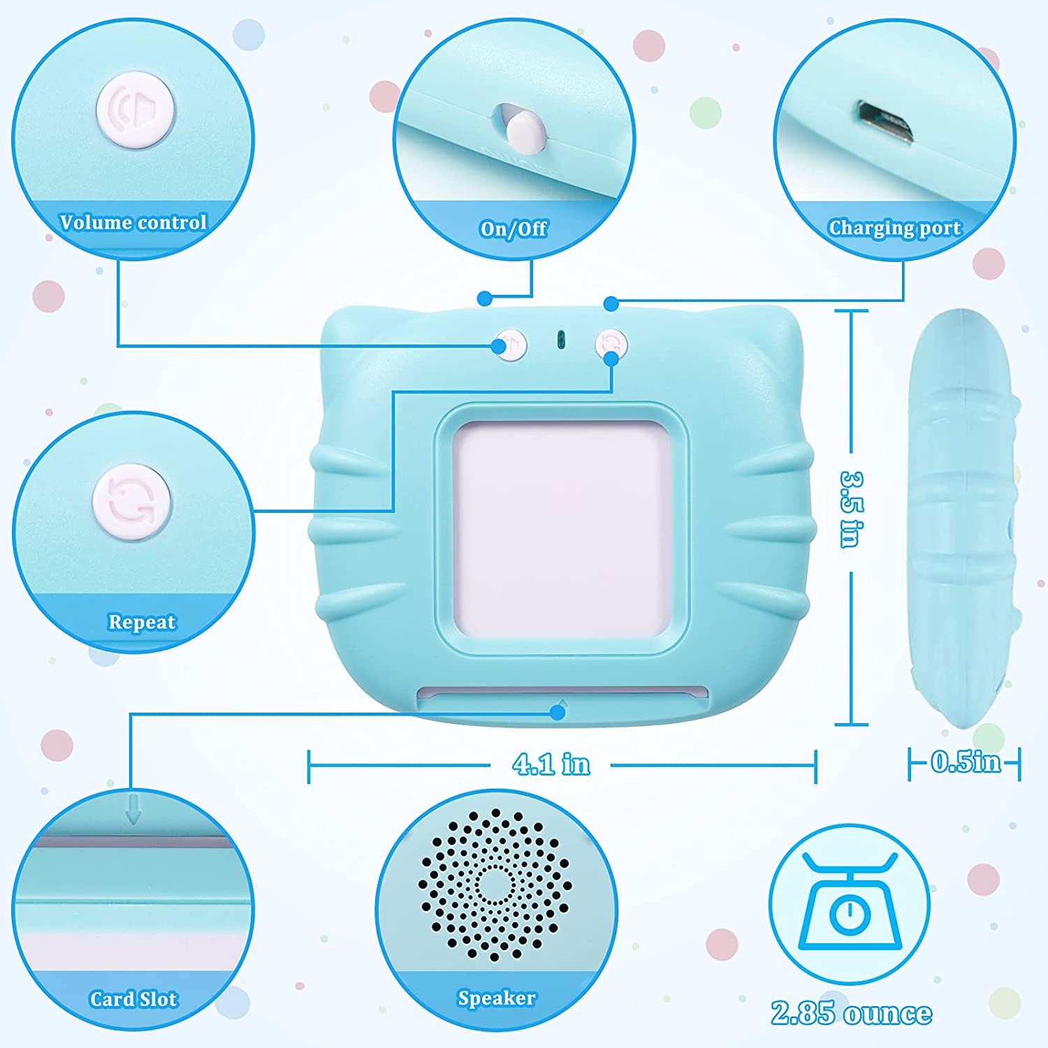 [Rechargeable & Light ] - The toddler toy comes with built-in rechargeable battery and can be used for up to 4.5 hours, no need to charge frequently. The card reader weights 71g and dimension is 4*3.5*0.5inches, easy for kids to hold. Volume is adjustable. A portable bag is provided for easy storage of the cards and card reader