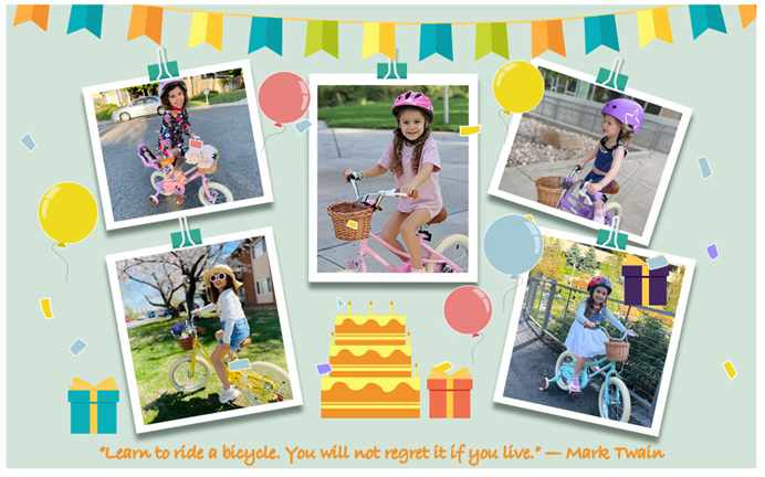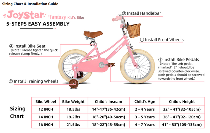 • 5, Choose the Right Size! 12 inch bike is suitable for 3-4 years old (33-41 inch) girls; 14 inch bike is suitable for 3-5 years old (35 - 47 inch) girls; 16 inch bike is suitable for 4-7 years (41-53 inch); The handlebars and seat height are all adjustable. Grow up with your children. The steel frame and fork are guaranteed by our LIMITED LIFETIME WARRANTY.