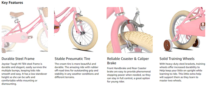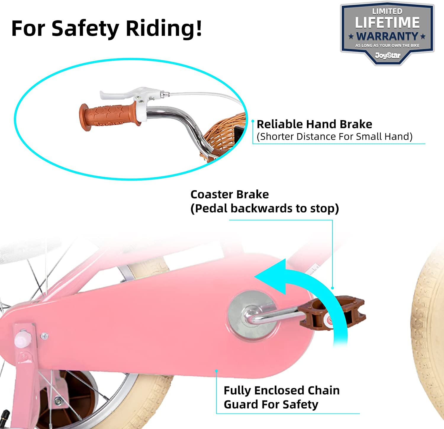 • 3, Safer Riding! The Front hand caliper Brake plus rear coaster/foot brake offer ample stopping power with more safety, wide 2.125" pneumatic tires add more stability, Sturdy steel frame and crank, Non-slip resin pedal, enclosed chainguard, front & rear reflectors and wheel reflectors make this bike safe to ride.