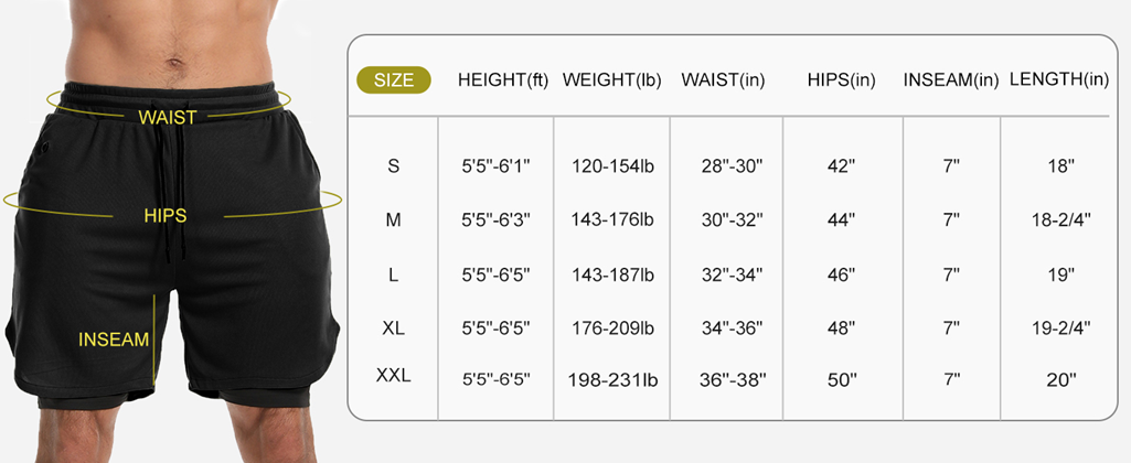 • SIZE: This running shorts dimensions are actually measured. Please check the size chart picture in the left column before purchase. Because of its elastic effect, 1 size up recommended if you prefer loose fit.