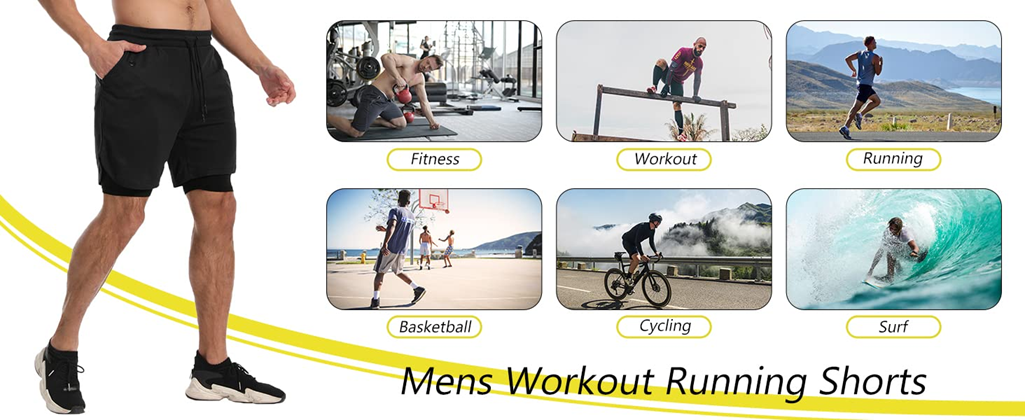 • 2-IN-1 DESIGN: Outer layer of this mens workout running shorts is 100% polyester mesh fabric, perfectly anti-pilling and breathable. The built-in workout shorts compression liner is 20% spandex and 80% polyester, elastic and skin-friendly enough for muscle healing.