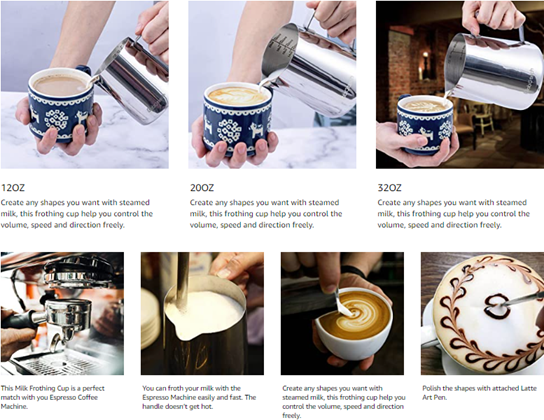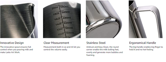 - 【Ergonomic Design】The unique design of the narrow spout is perfect for liquid pouring out. The handle doesn't get hot, it helps you to control strength and so focus on the latte art. The frothing pitcher has a beautiful stylish look.