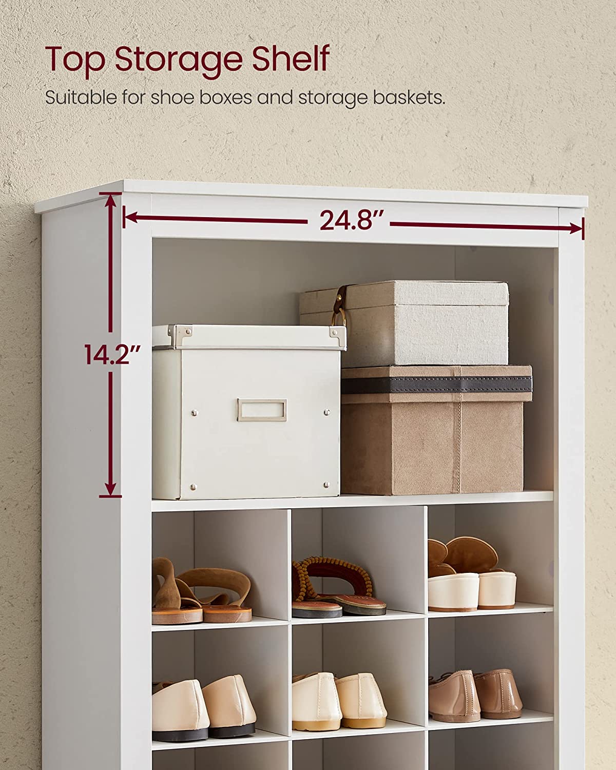 • Spacious Yet Space-Saving: Sized at 12.6”D x 24.8”W x 73.6”H, this tall shoe cabinet holds up to 30 pairs of shoes while taking up little floor space. Also, the top compartment is great for shoe boxes and storage baskets