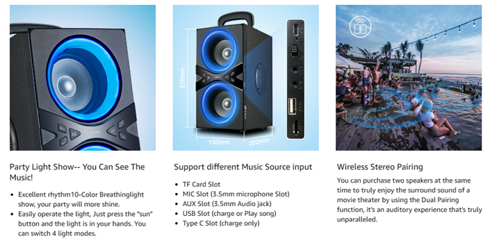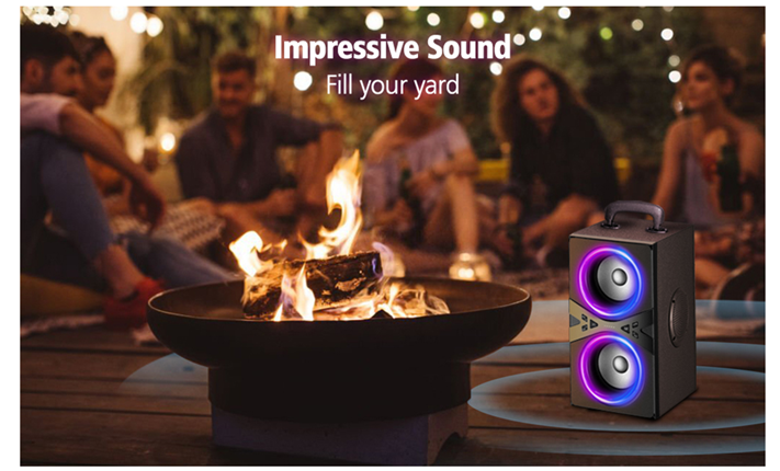 - 【Rich Punch Bass & Beats Driven Light Show】YIER party speaker is equipped with the latest bassup technology. Press this Bass button, this speaker will packs a punch and is enough to fill the whole party with music. And with the excellent rhythm light show, your party will more shine. Let's start preparing for summer vacations and parties.
