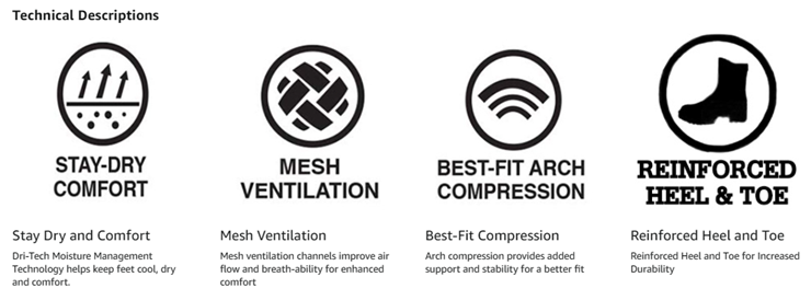 Dickies DRI-TECH comfort 6, 12 and 18 packs with wicking, moisture management fibers keeps feet dry, ventilation channels engineered for air circulation and moisture control, arch compression support hugs feet and keeps socks in place, while providing in-step support, superior fit and full cushion comforts.