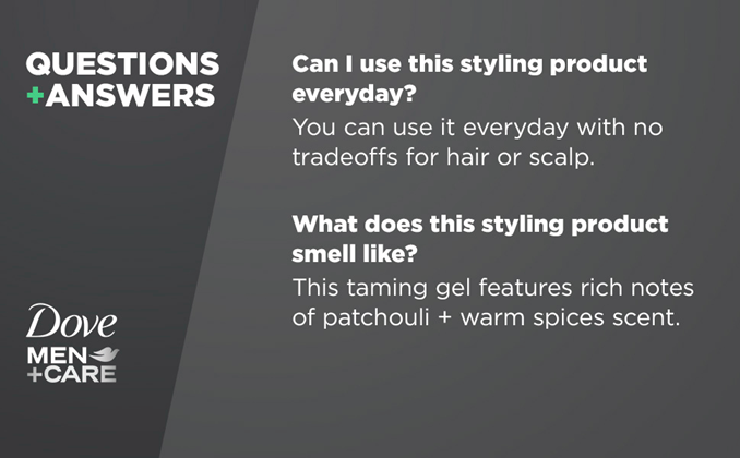 Dove Men+Care Hair Styling Aids are engineered specifically for men’s hair, giving it a stronger and more resilient style so that it can keep up with men’s active lifestyles, no matter what the day brings. Dove Men+Care Hair Taming Gel creates controlled, smooth, wet-look styles with a hold that lasts throughout the day. It's the perfect hair styling gel for active men or any man who desires a wet look combined with a high hold and a smooth, sleek finish, all in an alcohol-free formula. Dove hair products provide the finishing touch to a great hair care men's grooming routine so that men can look and feel their best throughout the day. Don’t forget that great hair care starts in the shower! Use the Dove Men+Care Hair care regimen for the best effect. This Taming Gel goes well with any of the Dove Men+Care Shampoos and Fortifying 2-in-1 Shampoo + Conditioners, including Fresh and Clean 2-in-1. Use it with the entire line of Dove Men + Care products for the perfect grooming regimen, such as Dove Men+Care Extra Fresh or Clean Comfort Body Wash, Dove Men+Care Dry Spray Antiperspirant, and Dove Men + Care Extra Fresh or Clean Comfort Antiperspirant Stick.