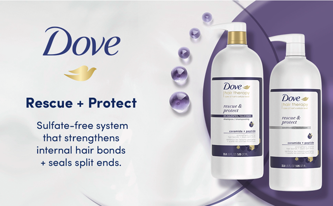 Dove Hair Therapy Rescue & Protect Shampoo and Conditioner System is formulated with ceramides and peptides, which strengthen internal hair bonds, seal split ends, and protect hair from heat damage and breakage. This sulfate-free system features potent moisturizers and nourishing ingredients for a beautifully strong hair.